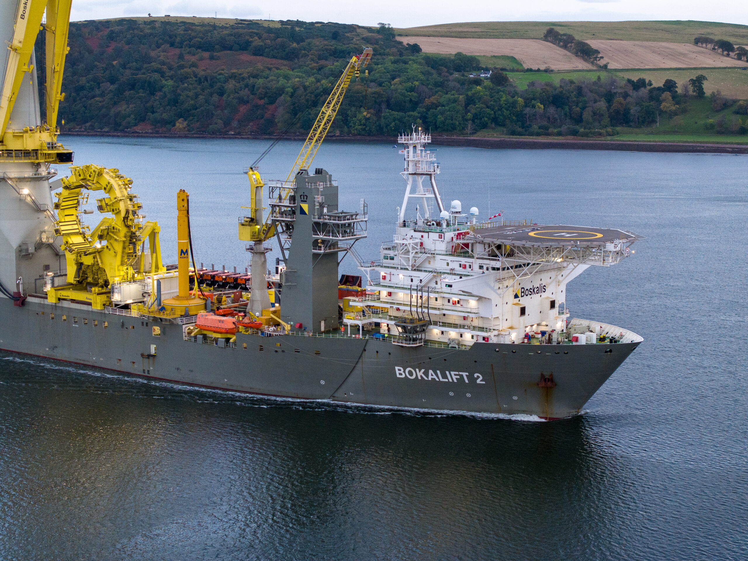 Bokalift 2 has arrived in the Cromarty Firth! This heavy lift crane ship is installing monopiles for the Ocean Winds Moray West windfarm project to the NE of the firth. The ship is uplifting XXL monopiles from the Sarens PSG marshalling facility at the Port of Invergordon. Very impressive to witness! (1st October 2023).